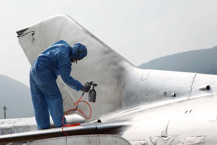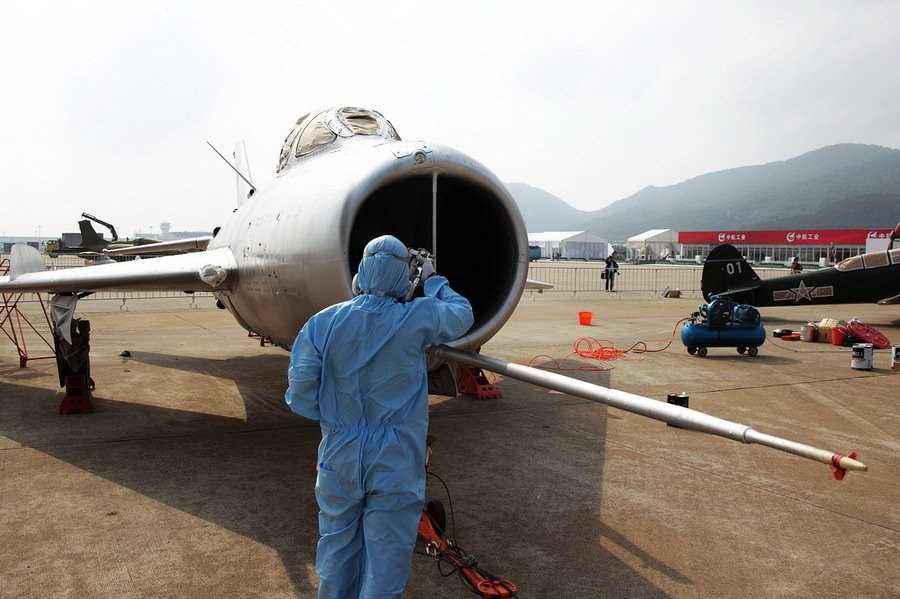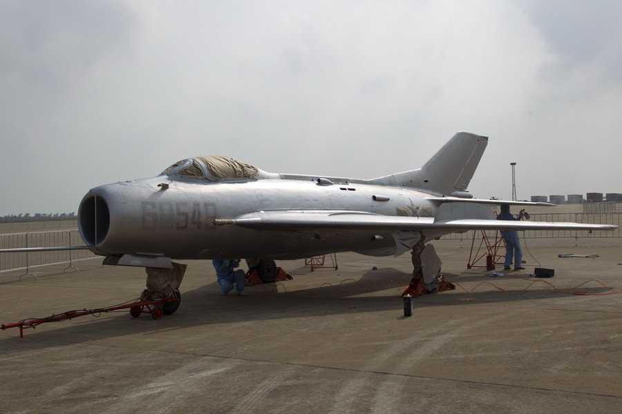 工作人員在整修60549號殲6。